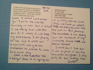 It’s spring in Texas, which means that wildflowers are everywhere. They grow all around, on the side of the roads, in backyards, in fields. My favorite flower is the bluebonnet, which also happens to be the Texas state flower. Because this is the season for bluebonnets, I decided to send Lavin a postcard with bluebonnets on the front, so she could see the beauty of God’s creation in Texas.